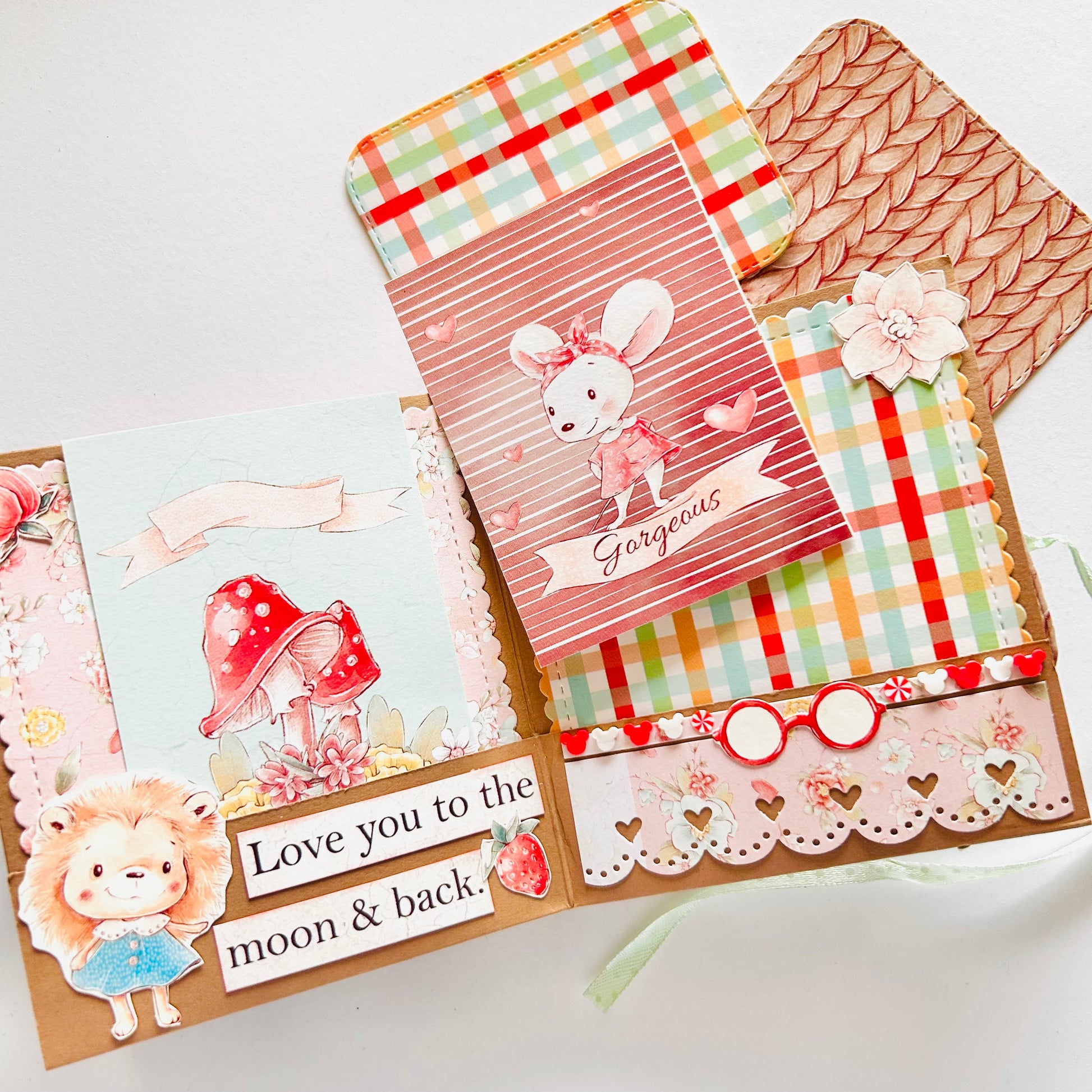 Celebrate the giggles, milestones, and magical moments of childhood with this handcrafted photo album designed in a joyful kids theme. Made with super cute printed papers and the sweet sentiment “Bundle of Joy” on the cover, this 4x4" album is bursting with charm—featuring die-cut elements, adorable critters, cheerful banners, and candy- and fruit-shaped sequins that sparkle with delight.