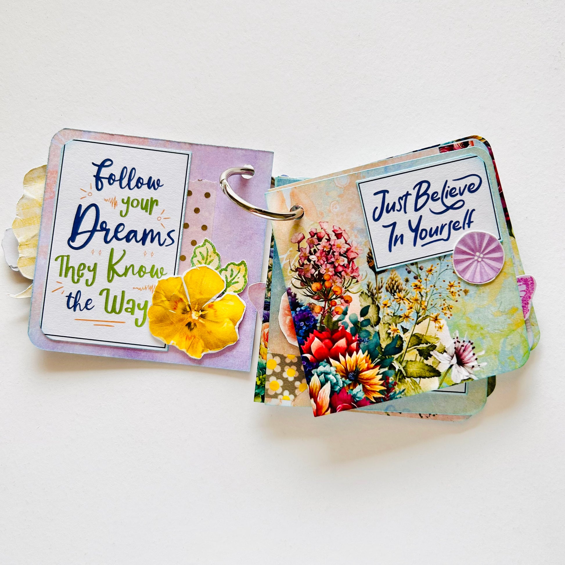 Decorated with delicate die-cut elements, inspiring quotes, and thoughtful text accents, this ring-bound journal includes space for mini photos, tags for journaling, and plenty of charm. Whether used as a gratitude journal, a mini scrapbook, or a heartfelt gift, it’s a little reminder of how amazing you truly are.