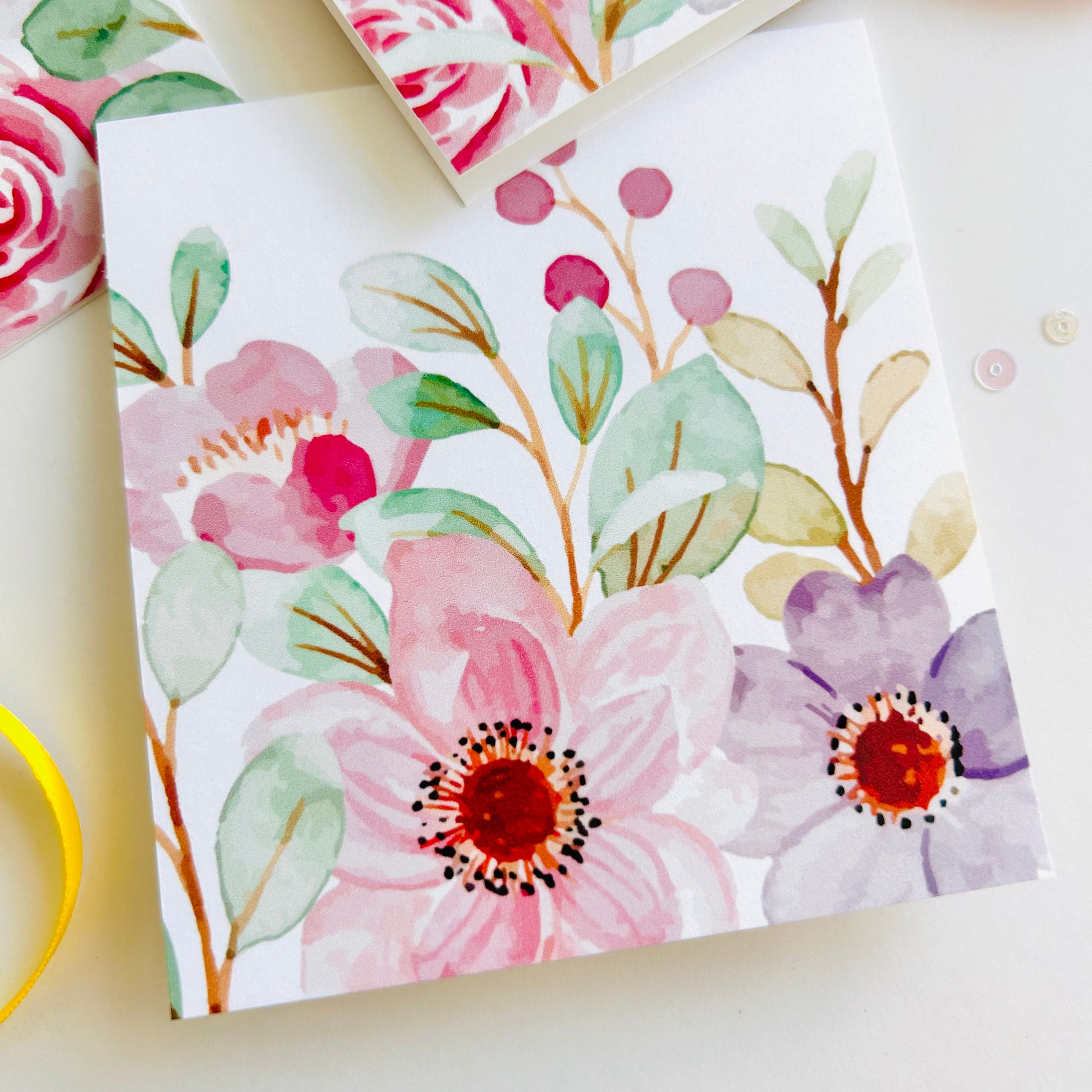 This set of three blank note cards features bold pink and purple flowers with sweeping leafy accents in a watercolor-inspired style. Printed on crisp white paper, each card offers a graceful canvas for your personal messages—perfect for thank-you notes, warm wishes, or everyday correspondence.