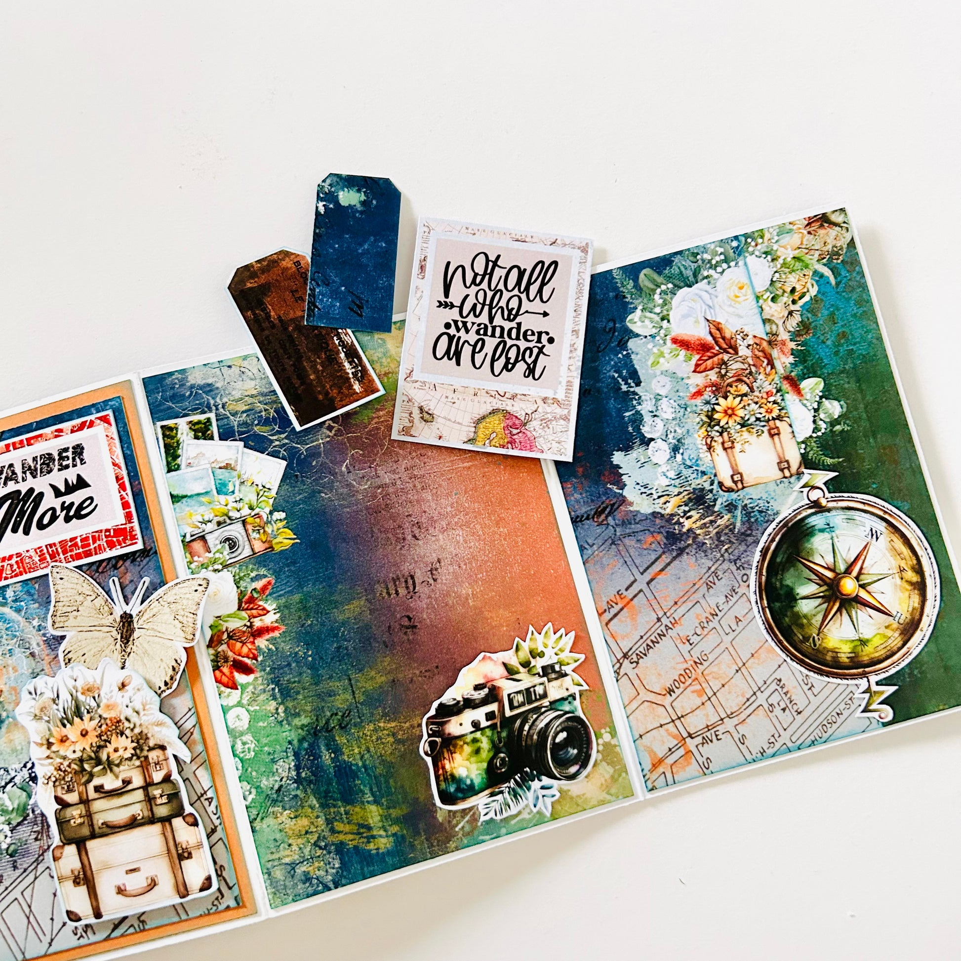 Celebrate your adventures with this handcrafted zig-zag fold photo album, designed with mixed media travel-themed printed papers and the inspiring sentiment “Wander More” on the cover. Compact yet full of charm, this 5.5x3.75" album unfolds like a journey—layered with die-cut travel elements and perfect for capturing snapshots from road trips, vacations, or spontaneous getaways.