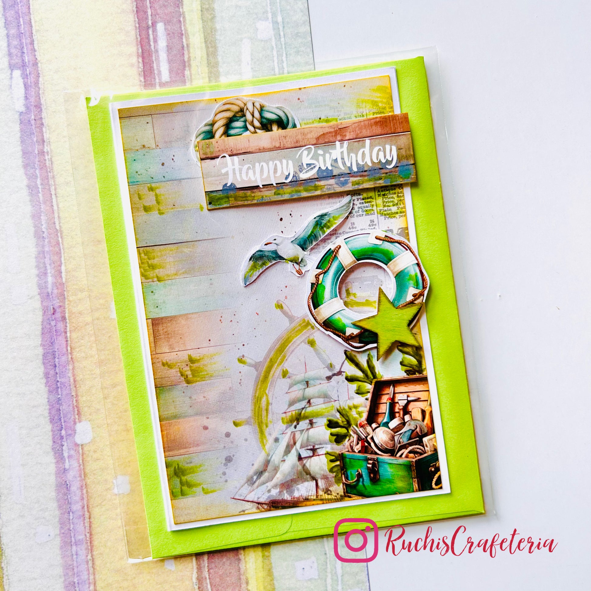 Celebrate a special day with the serene beauty of the sea. This handcrafted birthday card captures the essence of the ocean with a harmonious blend of turquoise, crisp white, and warm green tones, evoking sunlit waves and sandy shores.