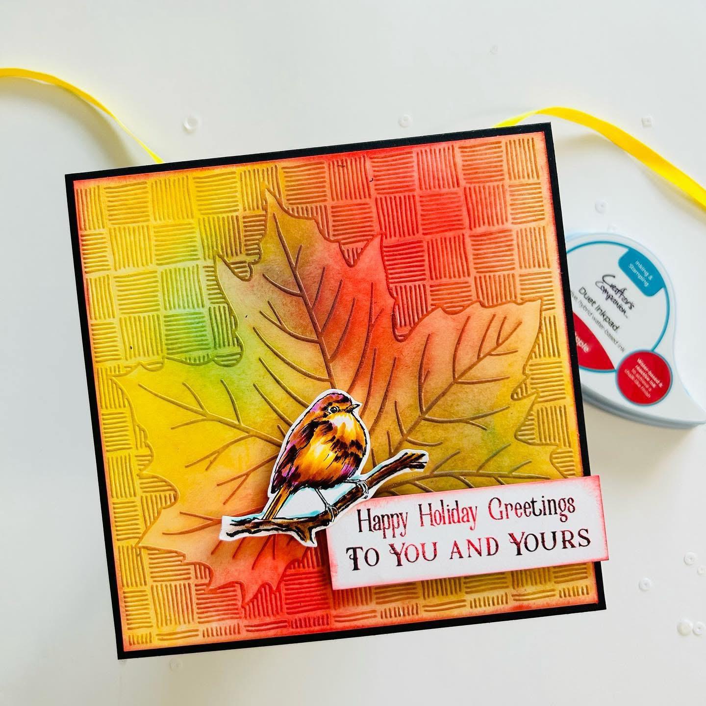 Celebrate the joy of the season with this handcrafted Christmas card, designed to share warmth and cheer. Featuring a graceful bird surrounded by festive leaves and winter accents, this card captures the spirit of Christmas in a unique, nature‑inspired design. The heartfelt message inside reads: “Happy Holiday Greetings To You And Yours.”