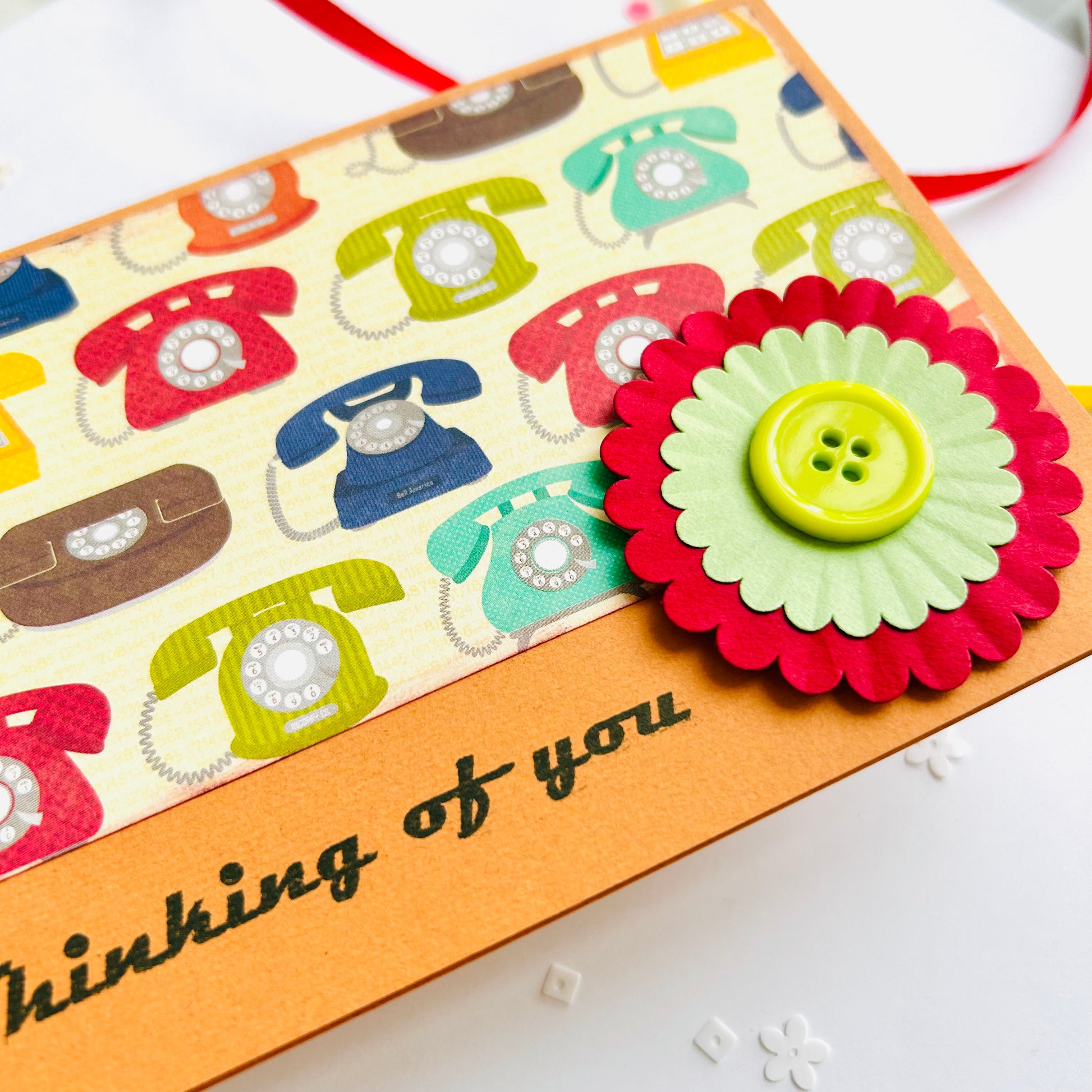 Send a thoughtful message with this handcrafted greeting card featuring a charming vintage phone pattern paired with a decorative flower on a soft light background. This card blends nostalgic style with heartfelt sentiment. The message “Thinking of You” makes it perfect for reaching out to loved ones with warmth and care.