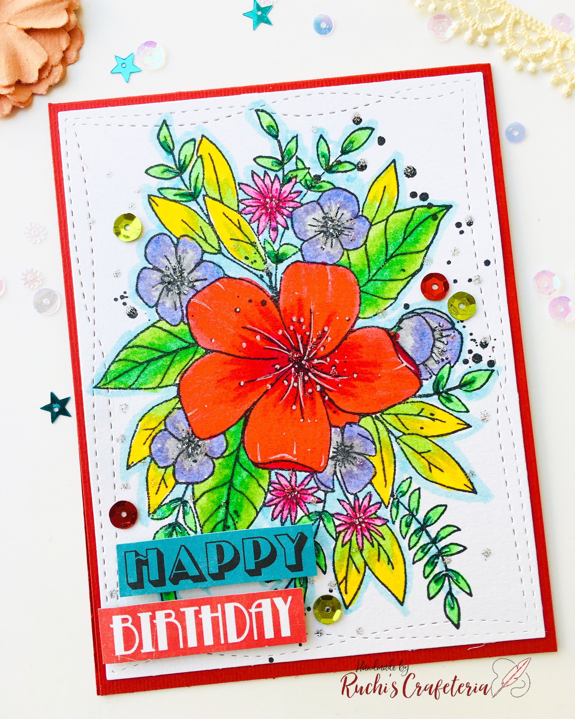 Celebrate birthdays with cheerful elegance through this handcrafted card, featuring a stamped bouquet, beautifully watercolored for a lively finish. The crisp white background highlights the joyful “Happy Birthday” sentiment, while the bold red card base adds a striking touch.