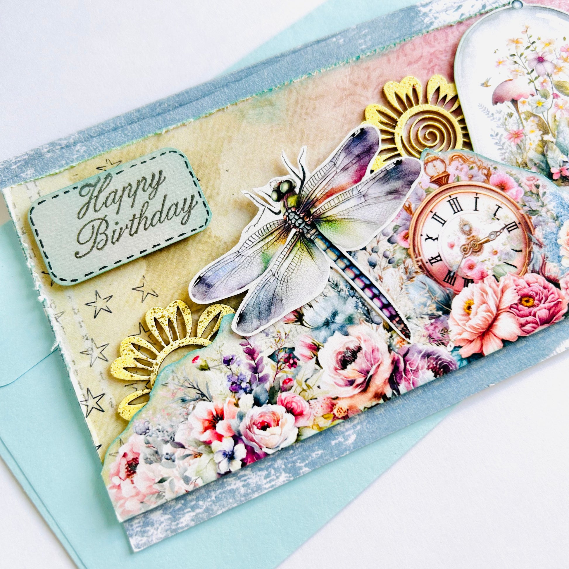 Celebrate birthdays with whimsical elegance through this handcrafted card, featuring a floral design accented with a dragonfly and vintage clock motif. Set against soft light blue papers, this card blends delicate artistry with timeless charm. The joyful inside message “...and many more” makes it a keepsake to treasure.