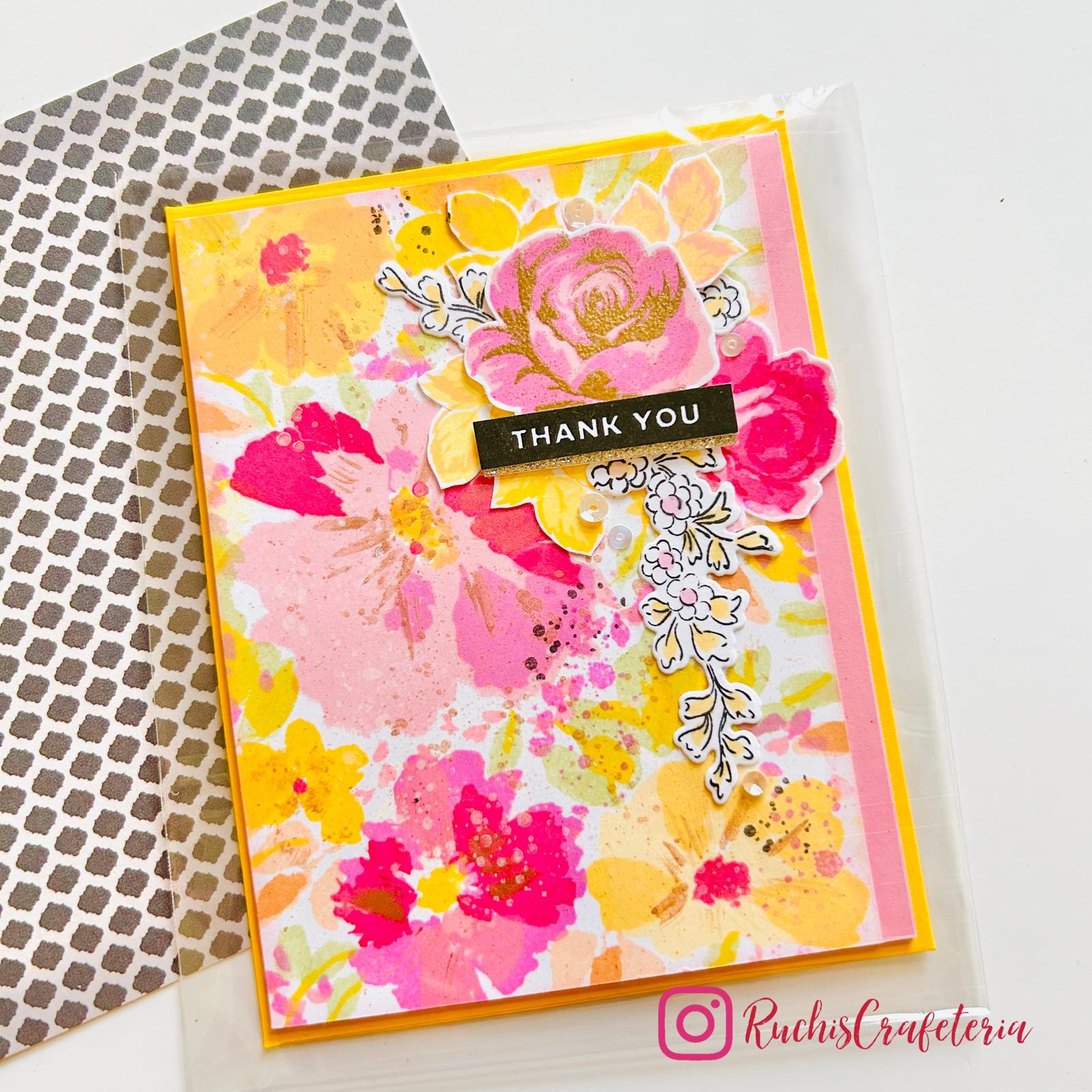 Express gratitude with elegance through this handcrafted greeting card featuring a stamped flowery background in soft shades of pink, yellow, and green, accented with a golden touch. This card is set on a vibrant pink card base for a warm and cheerful finish.