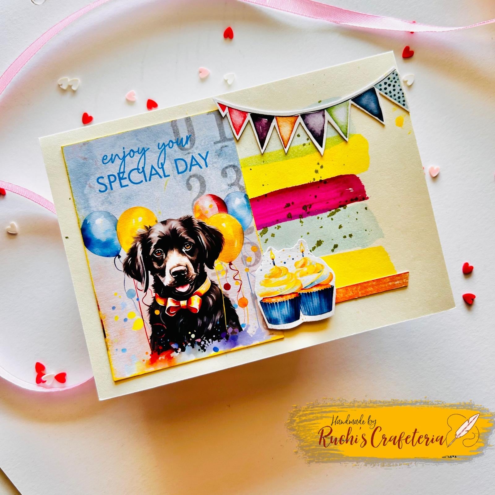 Bring smiles and joy with this handcrafted greeting card, designed on a crisp white background. Featuring a playful dog with balloons and the colorful sentiment “Enjoy Your Special Day”, this card blends fun, whimsy, and heartfelt warmth, making it a keepsake to treasure.