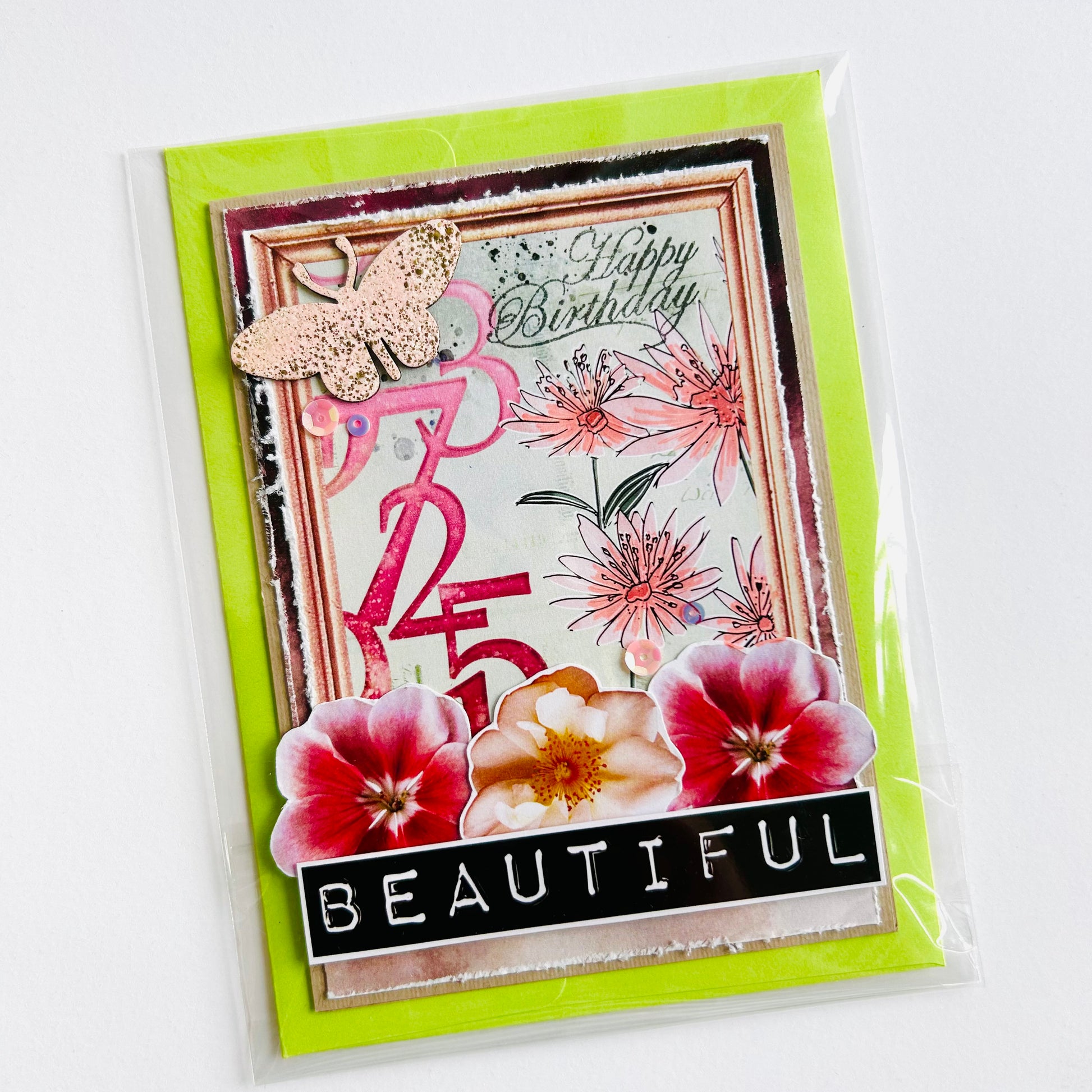 Celebrate birthdays with timeless artistry through this handcrafted card, featuring a floral design layered over a number‑patterned background and accented with an embossed butterfly. Set against a soft gray card base, this design blends delicate florals, textured detail, and heartfelt words into a keepsake to treasure.