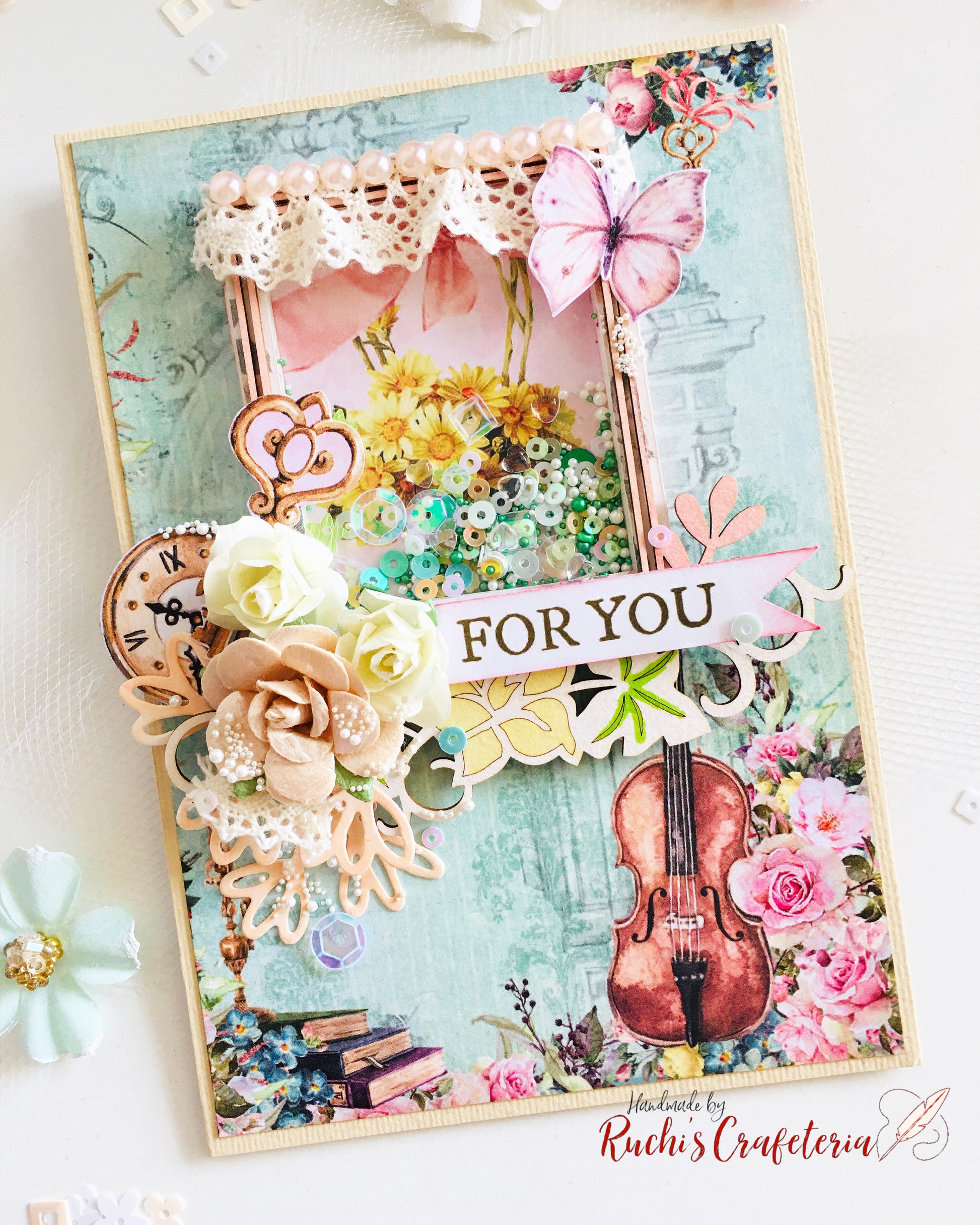 Celebrate artistry and elegance with this handcrafted easel shaker card, designed on light blue and teal patterned papers. Featuring flowers, a violin, a clock, and vintage keys, all accented with shabby chic elements, this interactive card blends timeless charm with heartfelt sentiment. The shaker window adds sparkle and movement, making it a keepsake to treasure.