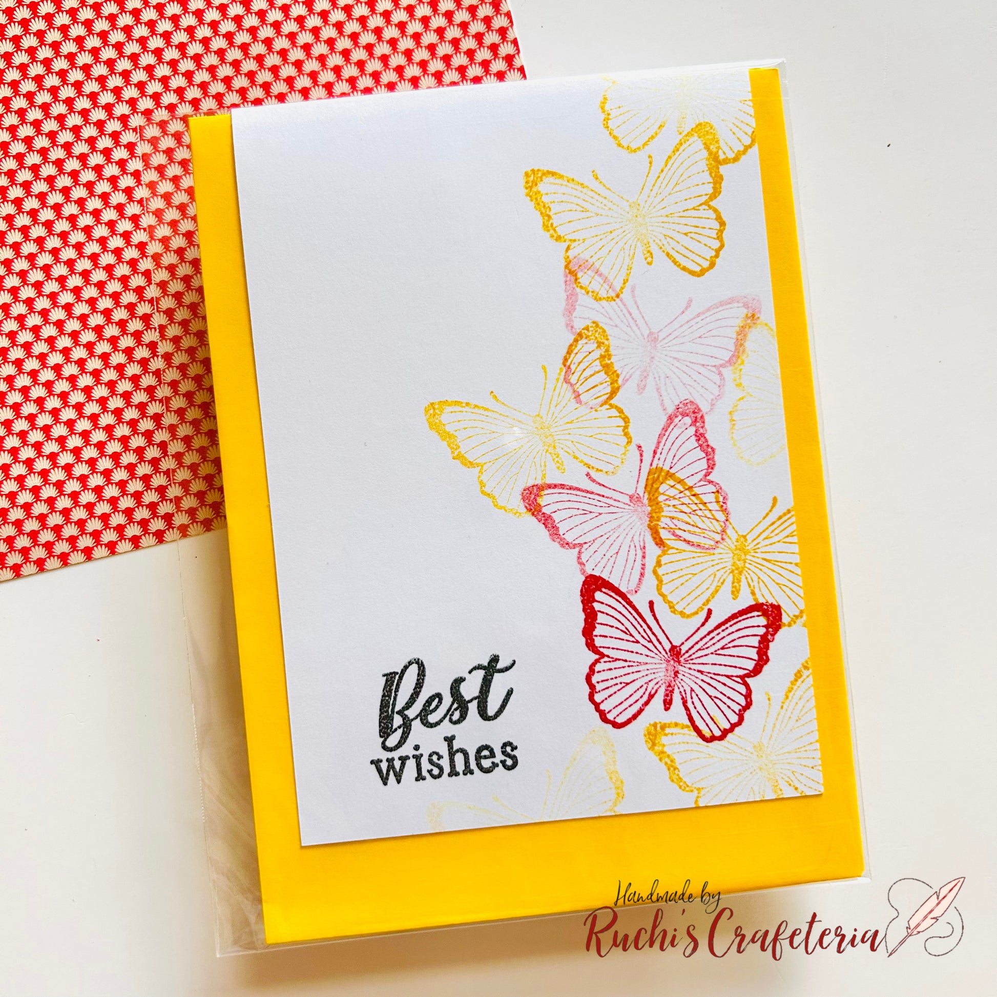 Send warm thoughts with this handcrafted card, designed on a crisp white background. Featuring stamped butterflies in cheerful shades of yellow and red alongside the uplifting sentiment “Best Wishes”, this card blends vibrant artistry with heartfelt charm.